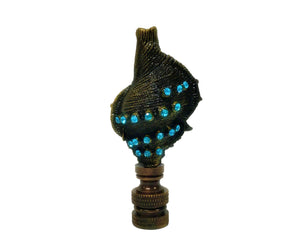 CAST SEA SHELL Lamp Finial with Aqua Rhinestones Aged Brass Finish, Highly detailed metal casting