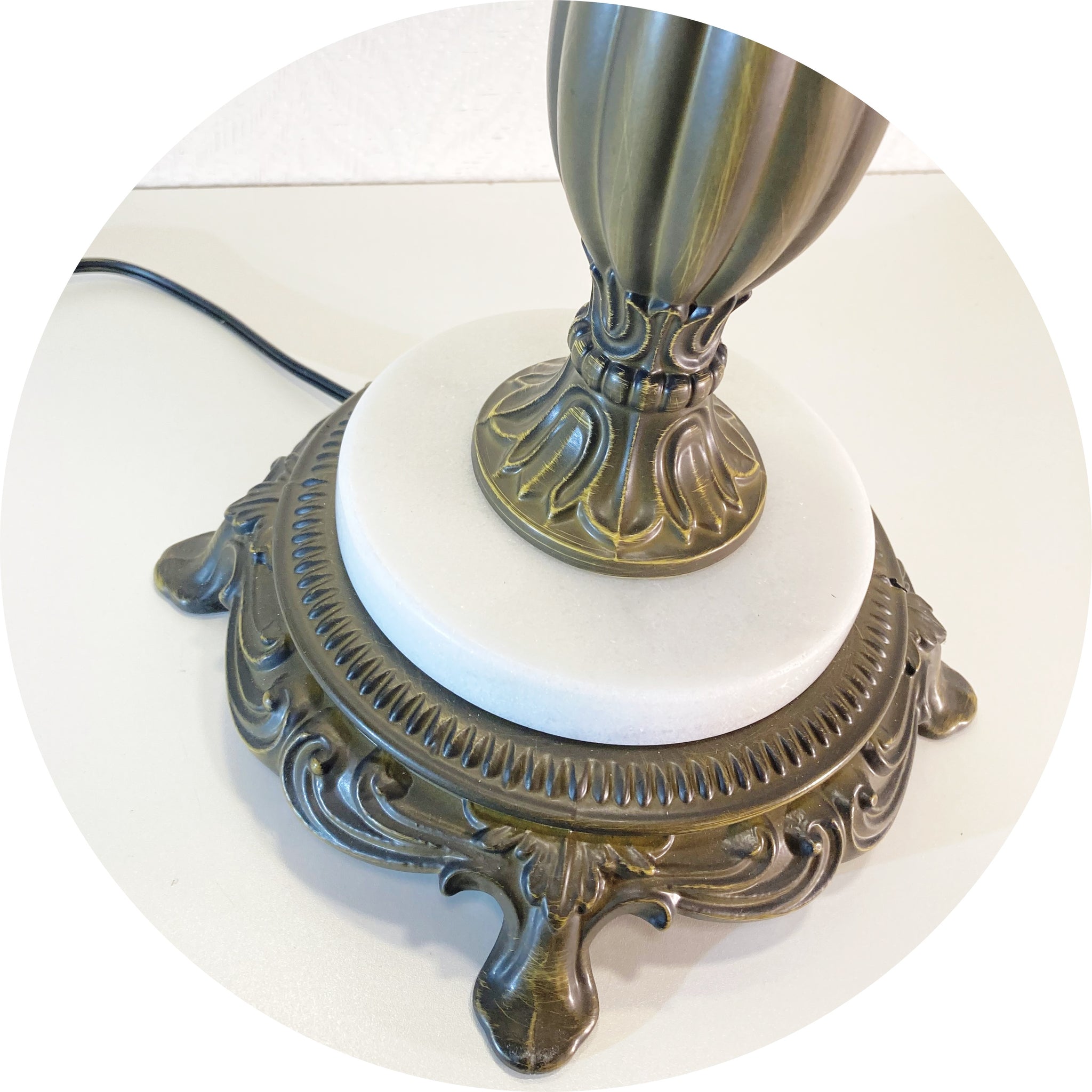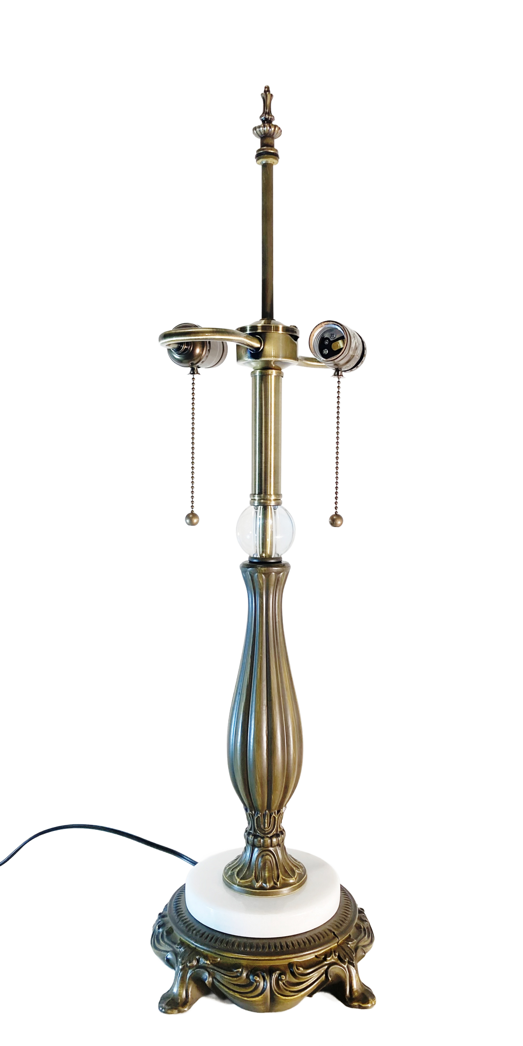 Vintage reproduction castings, double Pull-Chain sockets, natural marble, glass accents and a two-tone finish make this lamp base stand out in uniqueness and style.